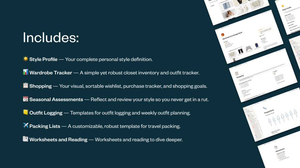 The Wardrobe Knowledge bank is your all-in-one style brain. Use it to define your style, make shopping plans and keep a wishlist, build a wardrobe inventory with data like cost per wear, create capsule wardrobes and packing lists, and more. No more fighting with outdated apps, losing track of your notes, or daydreaming about your style. This is a streamlined version of the setup I personally use to manage my wardrobe, and what I give to my style coaching clients #insidetheunfolding.